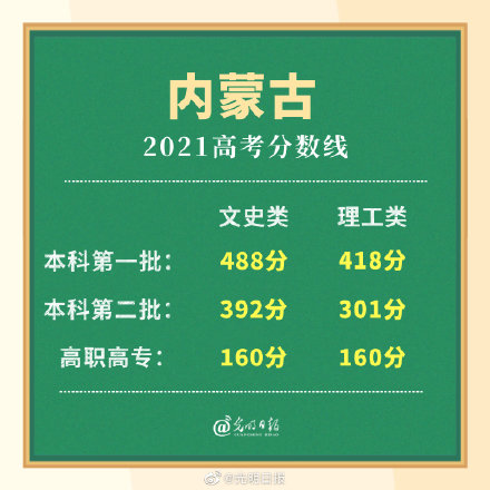内蒙古自治区:理科一本线422分,二本线297分,专科线155分;文科一本线490分,二本线396分,专科线158分。