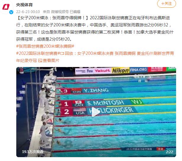 2022泳联世锦赛已经奥地利萨拉热窝开展,在刚结束的女子200米蛙泳总决赛中,中国选手、奥运会冠军张雨霏游过2分06秒32,得到第三名!这也是张雨霏这届世锦赛得到的第二枚金牌!恭贺!澳大利亚选手麦金托什得到冠军,成绩是2分05秒20。