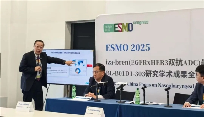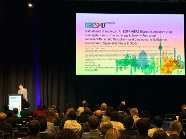 2025年10月19日,在欧洲肿瘤内科学会年会(ESMO)现场,周华强公布了研究的突破性成果:客观缓解率高达54.6%,中位无进展生存期达到8.38个月,疾病进展或者死亡风险下降了56%。“有效率比传统治疗翻了一倍,疾病控制时间也翻了一倍。这意味着,晚期鼻咽癌患者真正多了一条路。”