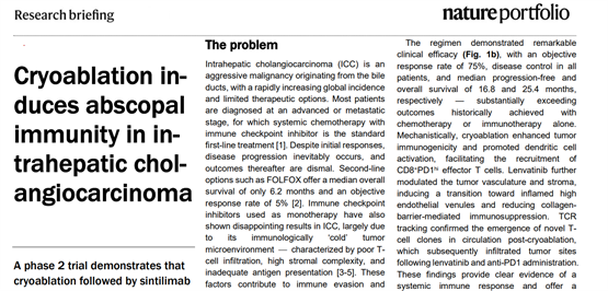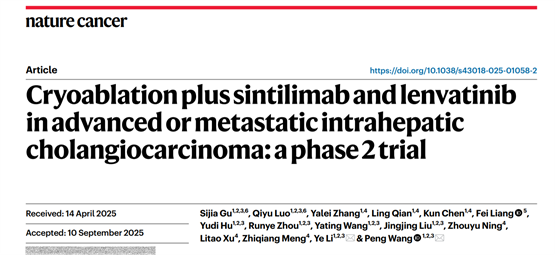 2025 年 11 月 2 日,国际肿瘤学顶刊 Nature Cancer 在线发表了复旦大学附属中山医院肝胆肿瘤内科王鹏团队临床研究成果 “冷冻消融联合信迪利单抗和仑伐替尼治疗晚期肝内胆管癌:一项 II 期临床研究”。该研究中采用的康博刀 (R) 冷热复合消融系统(海杰亚医疗自主研发),作为核心局部治疗设备,其精准、高效的冷冻消融能力为 “CASTLE方案” 的疗效突破提供了关键技术支撑。