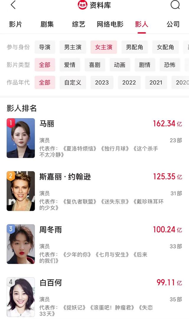 在女主演票房榜里,周冬雨凭借超百亿主演票房位列第三,白百何以99.11亿票房紧随其后,女主演票房榜第一名是马丽,第二名是斯嘉丽·约翰逊。